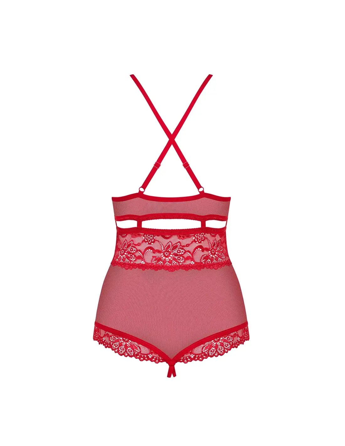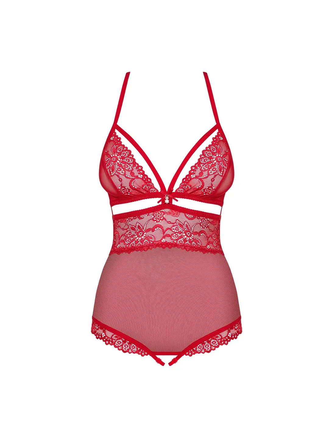 Body 838-Ted Obsessive Vermelho. Noite agradável com o seu amante? Coloque este body encantador! E irá sentir-se realmente fantástica. Verifique estes detalhes:- Tiras decorativas e belas rendas - visual deslumbrante;- Design sexy abaixo do busto;- Virilha aberta - descobrirá novas experiências;- Alças ajustáveis - fáceis de regular;- Pingente com jóias brilhantes - bonito e elegante;- Tecido macio e elástico (90% poliamida, 10% elastano).