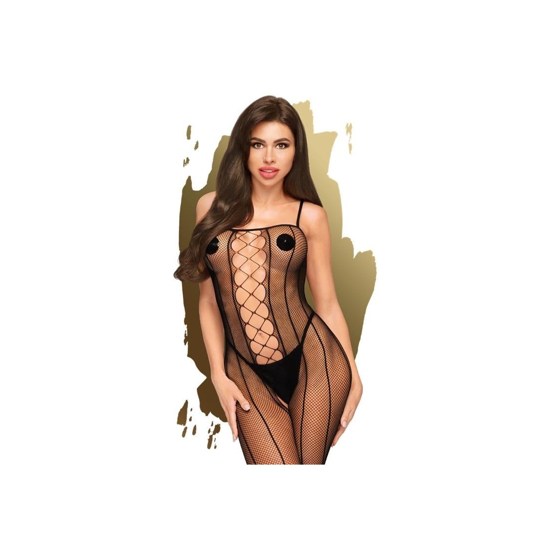 Catsuit Drop-Dead Tasty Penthouse Preto. Catsuit com topo cruzado, aberto na virilha e com alças finas.