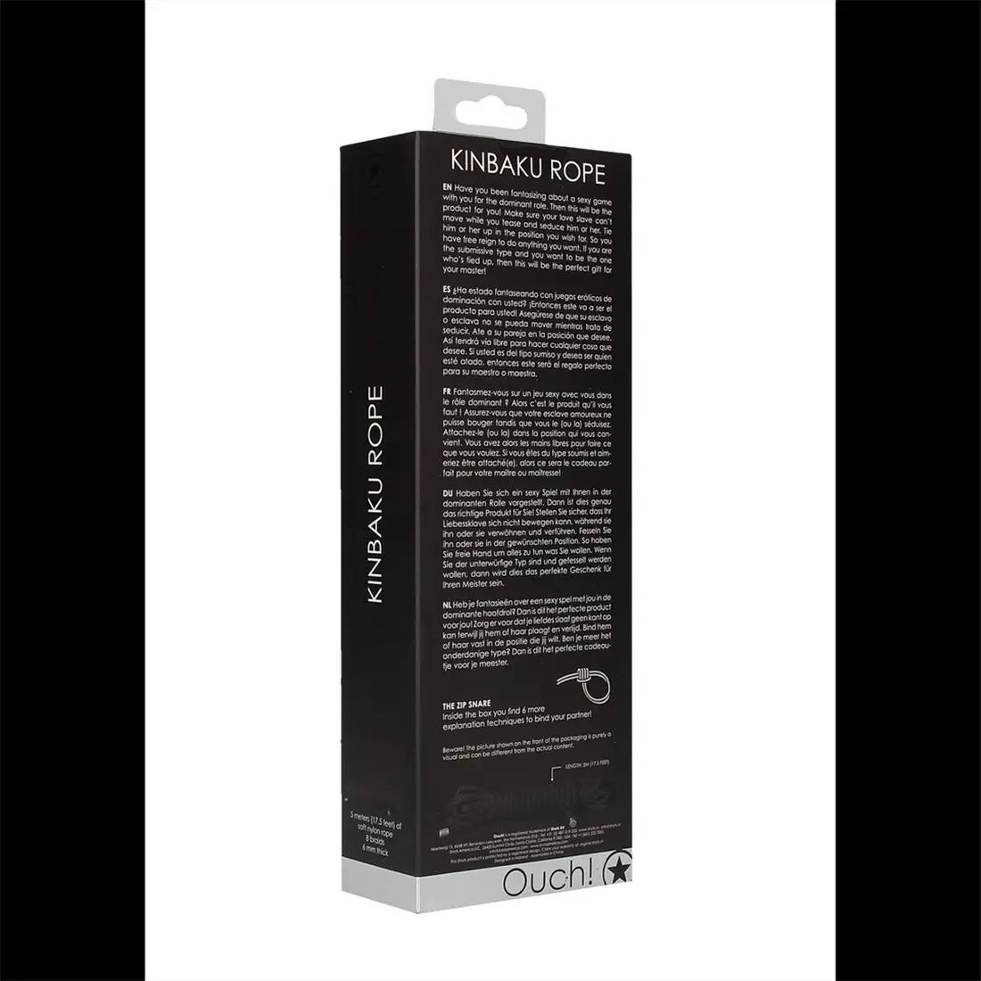 Corda de Restrição Kinbaku 5 Metros Preta. KINBAKU em japonês significa sujeição. Esta corda é bastante suave e macia, ideal para principiantes. O Nylon é o material sintético de eleição dos amantes de bondage por ser muito fácil de trabalhar e por não encolher em contacto com a água, o que aumenta a quantidade de jogos ao seu alcance. No interior encontrará instruções de como atar o seu submisso.