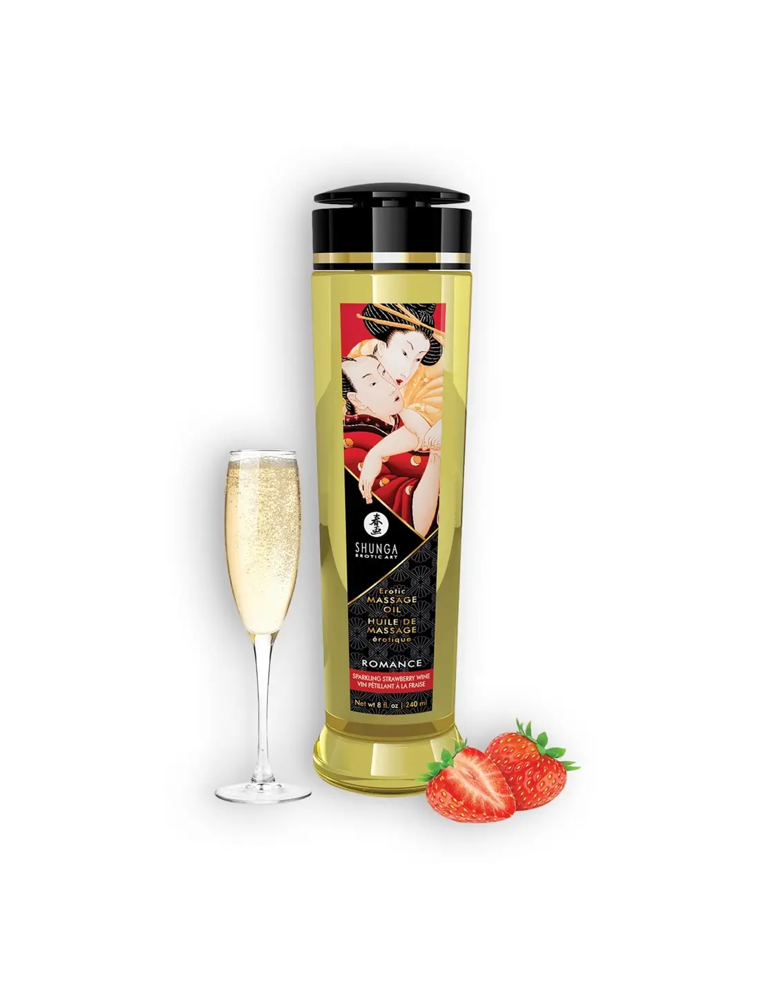 Óleo De Massagem Shunga Romance Morango Champanhe 240ml. Aprecie os prazeres de dar ou receber uma massagem sensual e erótica. Este óleo combina uma mistura exclusiva de óleos de amêndoa, semente de uva, abacate, vitamina E e extratos de ylang-ylang. Todas as suas características fazem-no deslizar suavemente e facilmente sobre a sua pele. Romance tem uma incrível fragrância a morango e champanhe e fará com que os seus sentidos atinjam o pico do prazer. Utilizado por massagistas profissionais. É compatível com preservativos. Não é comestível.