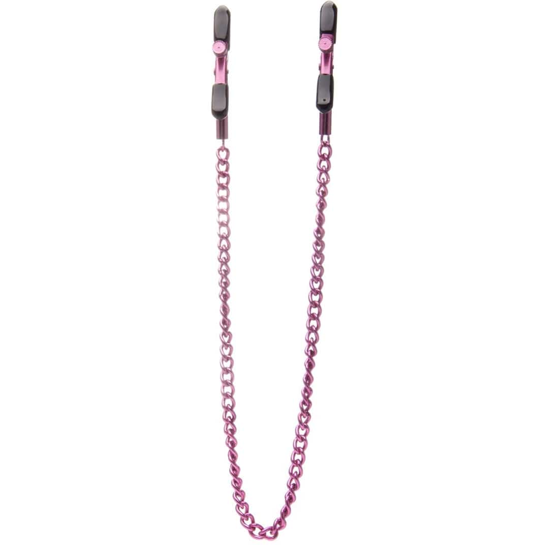 Pinças para Mamilos Ouch! Adjustable Nipple Clamps Rosa. Faça com que as suas fantasias sejam ainda mais sensuais com as ADJUSTABLE NIPPLE CLAMPS. As pinças e a corrente de metal, foram concebidas com aço inoxidável, alumínio e são sem níquel. As pinças são ajustáveis e revestidas com borracha, são unissexo e muito fáceis de utilizar, para isso basta apertar a pinça de mola sobre o mamilo e ajustar o parafuso, até obter a tensão preferida. Os terminais estão ligados entre si, por uma sóbria corrente, que lhe confere um toque mais selvagem.