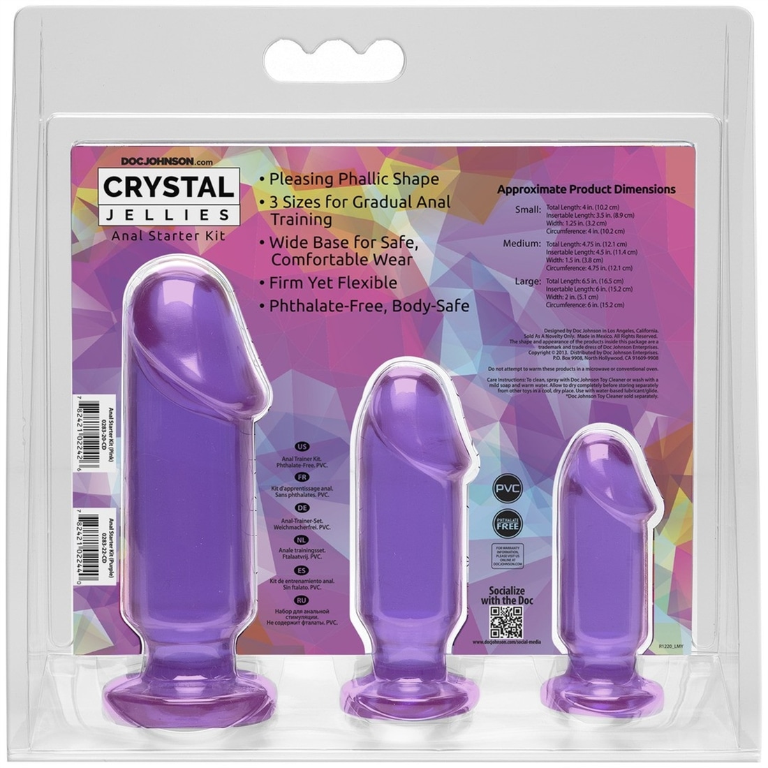 Kit de Plugs Anais Anal Starter Kit Roxo. Kit de três plugs anais em tamanhos graduais para iniciação da prática anal. Este kit inclui um dildo pequeno apto para iniciantes, um dildo médio para sensações mais fortes, e um dildo grande para jogos mais profundos e intensos. As bases de sucção fixam-se de forma segura quando colocadas sobre uma superfície plana, e todos os plugs são indicados para usar com arnês. Não possui ftalatos, é seguro para a pele e inclui a fórmula antibacteriana Sil-A-Gel.