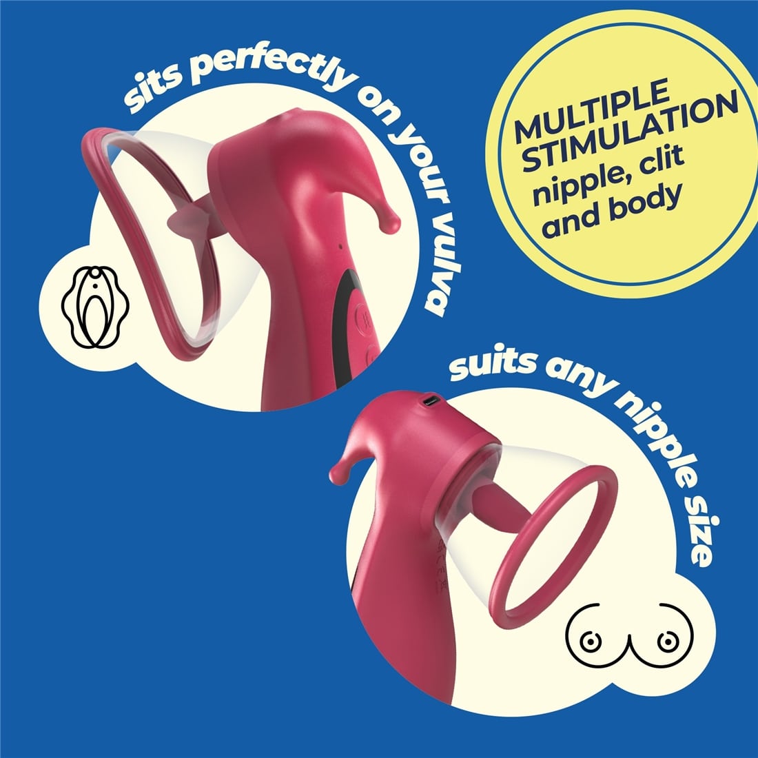 Os seus 2 copos amovíveis são perfeitos para serem utilizados na vulva e nos seios. Percorra os 7 incríveis modos de sucção e selecione o que mais lhe convém. Quer ainda mais prazer? Ligue os seus modos de lambidela e alterne entre as 3 velocidades e os 7 modos.